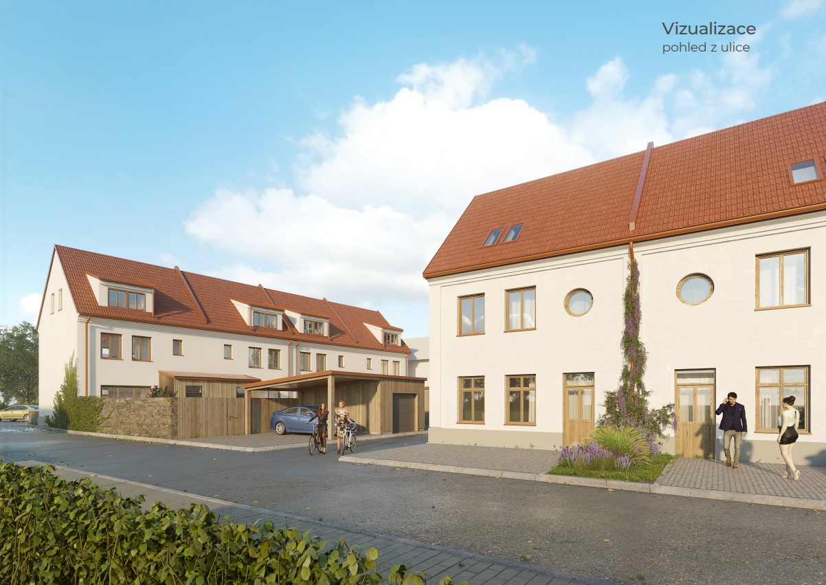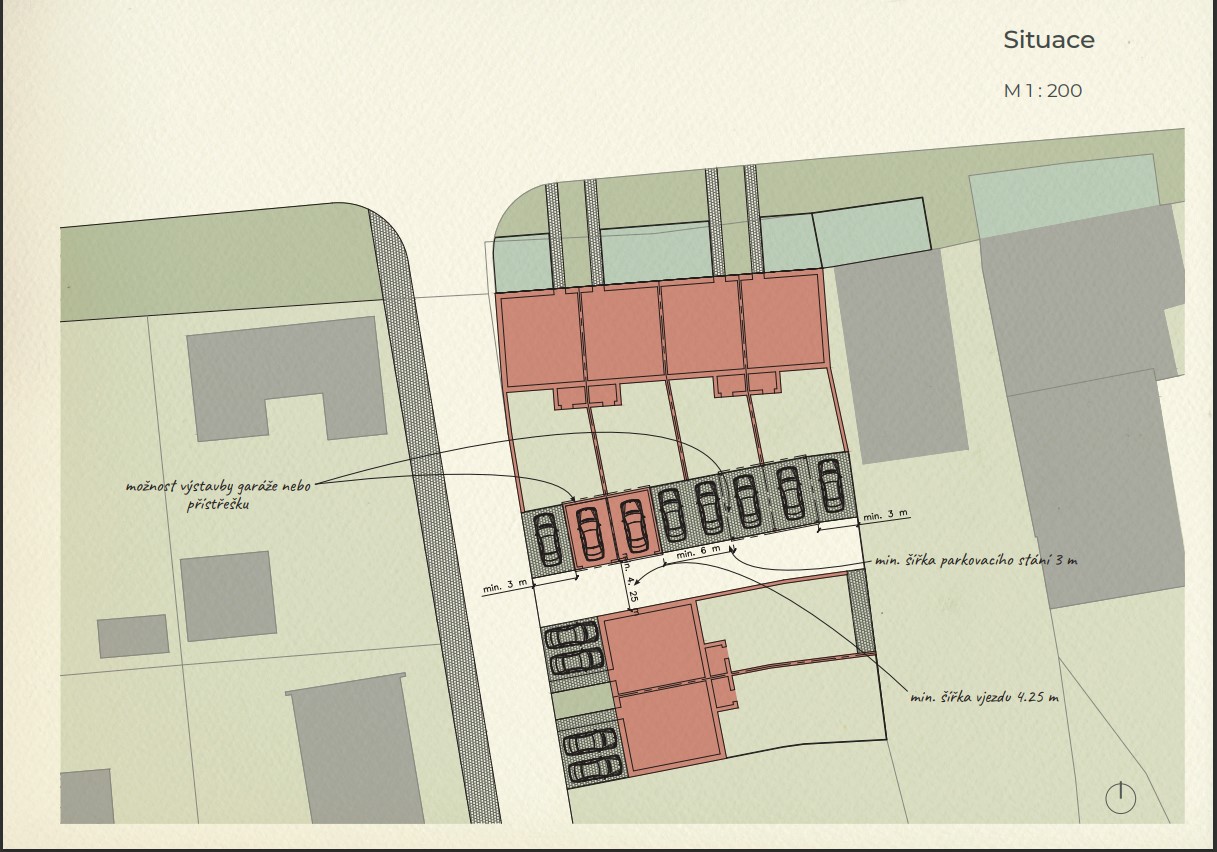 Projekt se nachází ve vesnici Hosov u Jihlavy, parcelní číslo 5/1. Na místě bývalého statku navrhujeme šest řadových domů. Čtyři domy, které se otáčejí do návsi mají na konci zahrady navržena 2 parkovací místa z čehož jedno z nich může být zastavěno garáží nebo přístřeškem.
