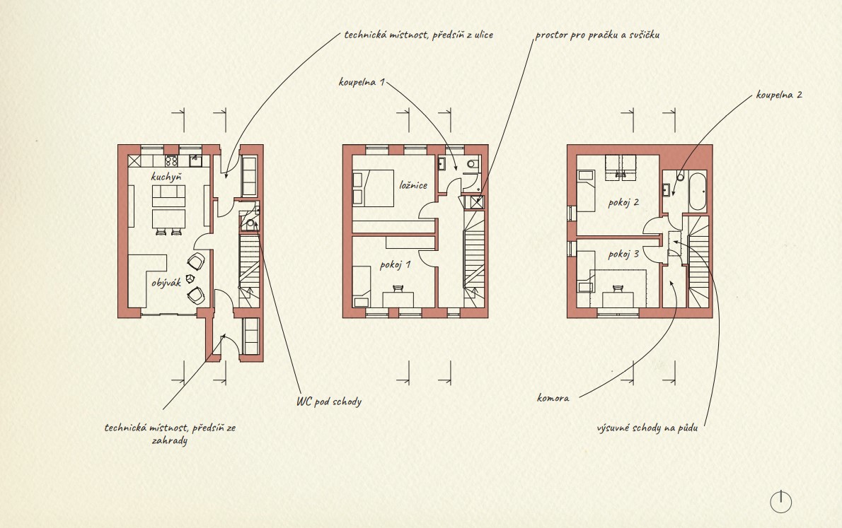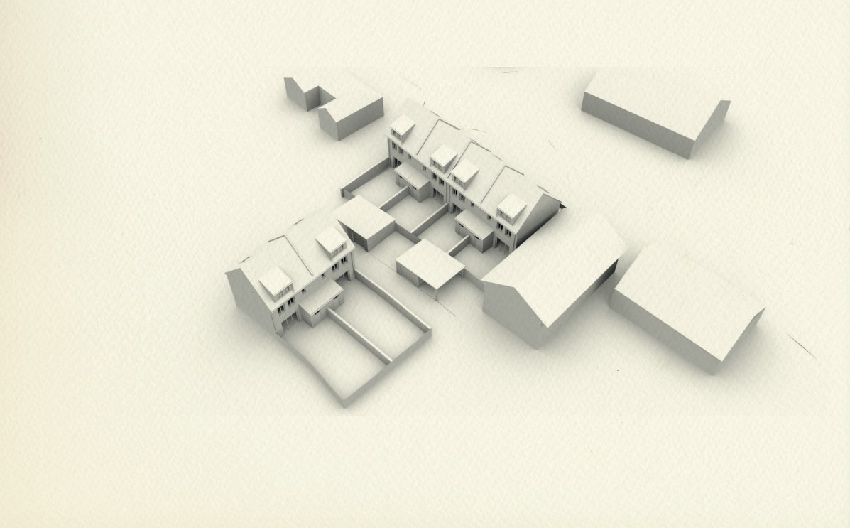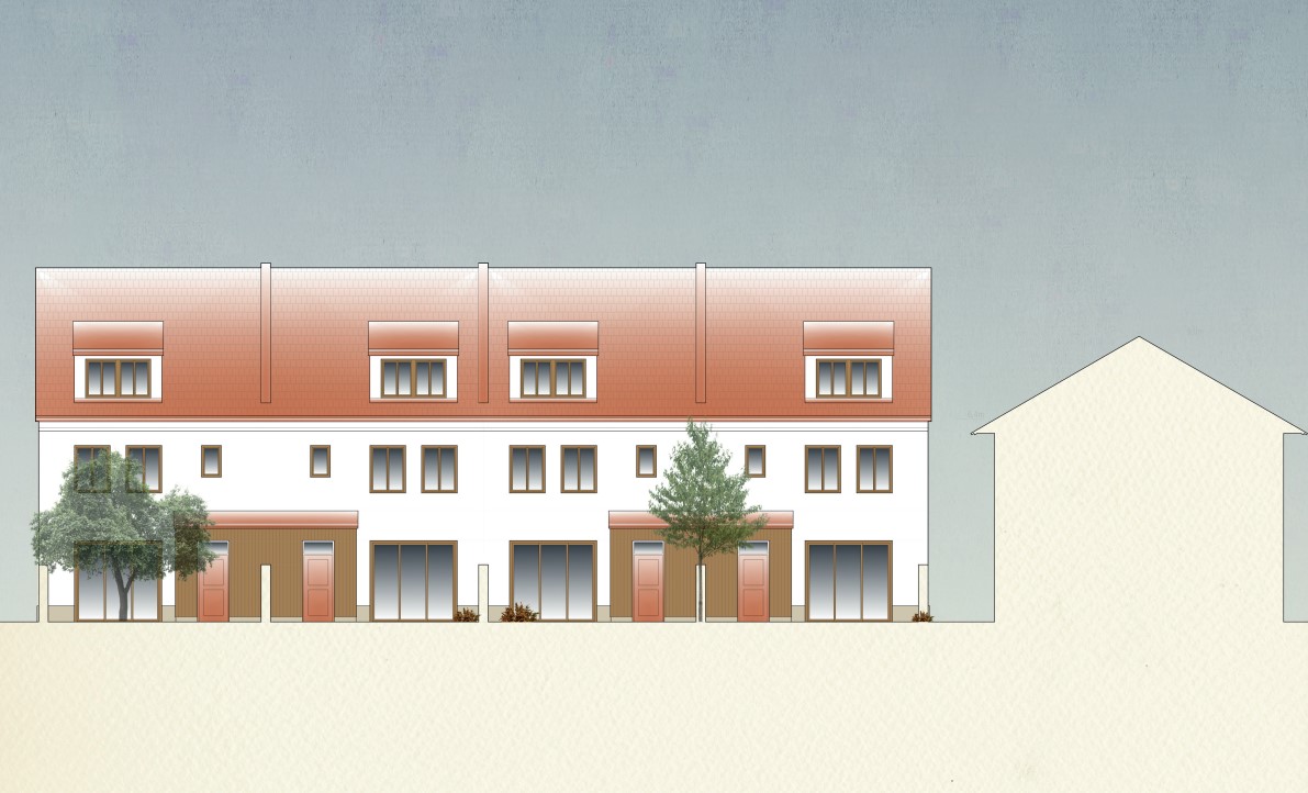 Projekt se nachází ve vesnici Hosov u Jihlavy, parcelní číslo 5/1. Na místě bývalého statku navrhujeme šest řadových domů. Čtyři domy, které se otáčejí do návsi mají na konci zahrady navržena 2 parkovací místa z čehož jedno z nich může být zastavěno garáží nebo přístřeškem.